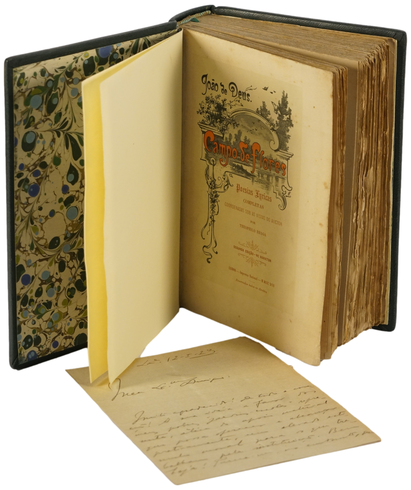 Acompanhado de uma carta autógrafa e uma “plaquete” com um “desenho para os azulejos artísticos do Pintor Joaquim Lopes inaugurados no Colégio João de Deus” e de O POETA JOAO DE DEUS E OS LIVREIROS MAGALHAES & MONIZ propósito do Campo de Flores em que se reimprimem as Flores do Campo e Folhas Soltas do mesmo auctor. Porto. Typographia de A. J. da Silva Teixeira. 1893. 12x17,5 cm. 16 págs. B.