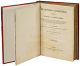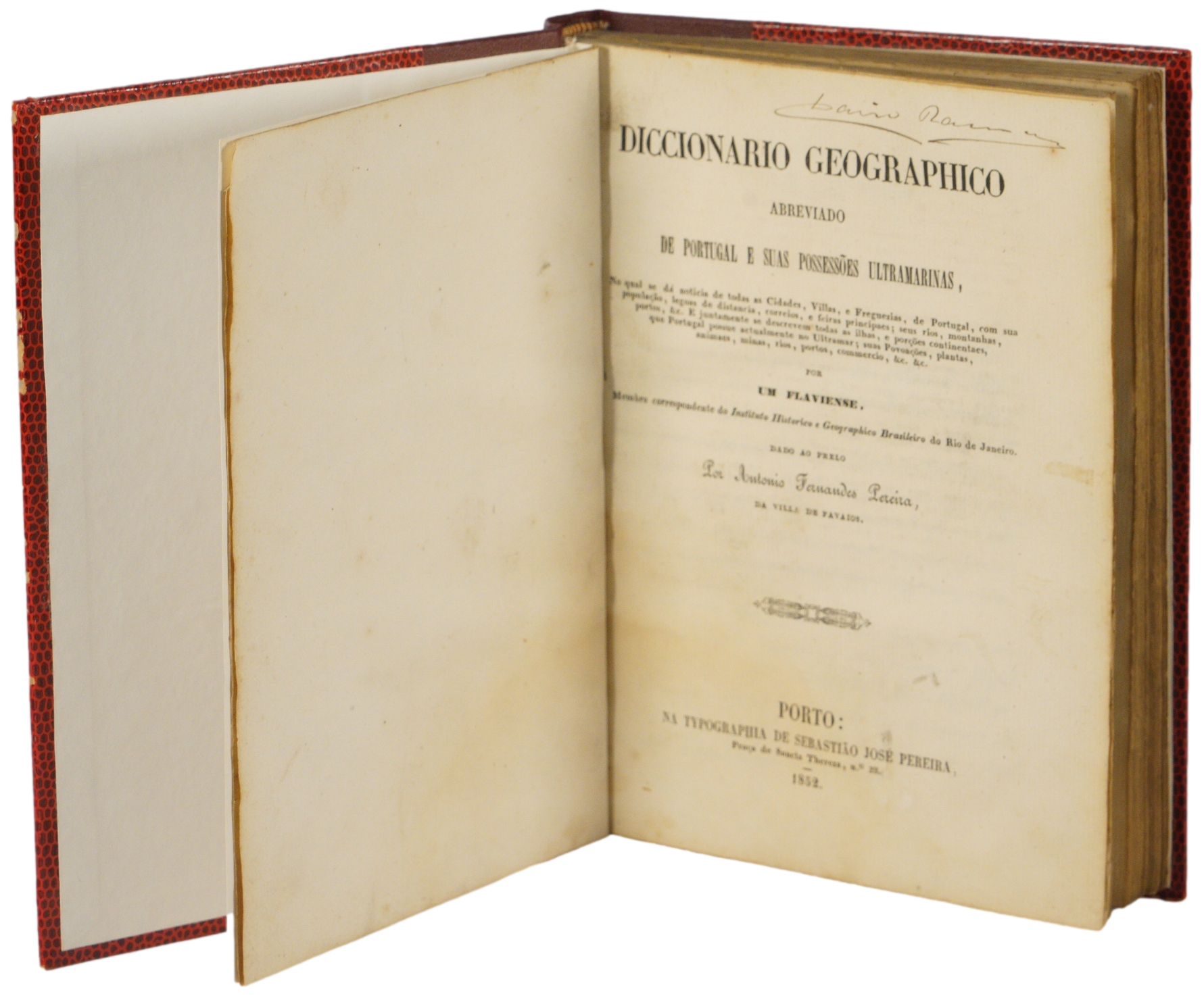 04918-L25MARANHÃO (Fr. Francisco dos Prazeres)].— DICCIONARIO GEOGRAPHICO ABREVIADO DE PORTUGAL E SUAS POSSESSÕES ULTRAMARINAS, no qual se dá noticia de todas as Cidades, Villas, e Freguezias de Portugal, com sua população, legoas de distancia, correios e feiras principaes; seus rios, montanhas, portos, &c. E juntamente se descrevem todas as ilhas, e porções continentaes, que Portugal possue actualmente no Ultramar; suas Povoações, plantas, animaes, minas, rios, portos, commercio, &c. &c. Por Um Flaviense... Dado ao prelo por António Fernandes Pereira, da Villa de Favaios. Porto: Na Typographia de Sebastião José Pereira. 1852. 16x21 cm. II-258-IIpágs. E.