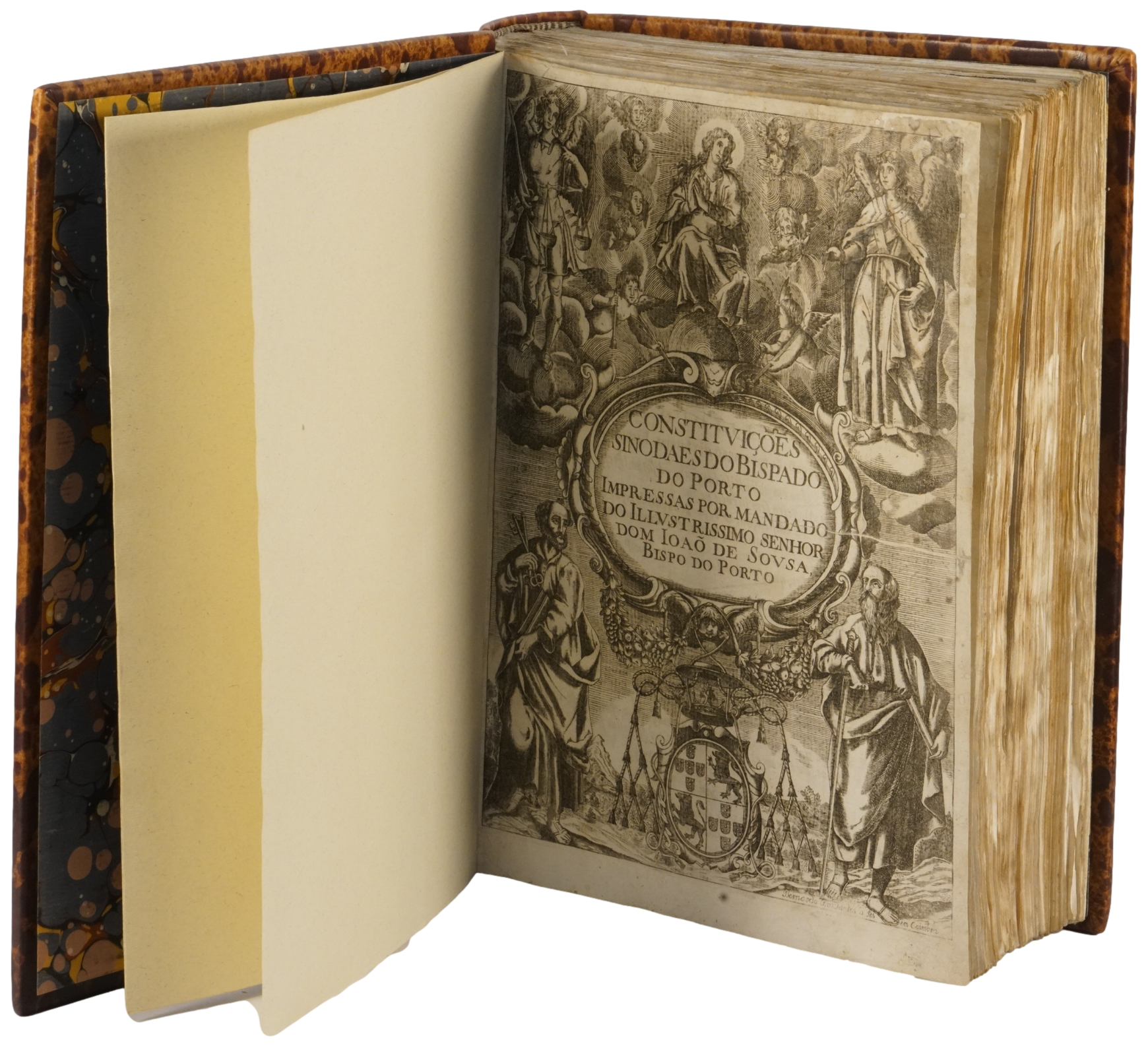 26552-FMACONSTITUIÇOES // SYNODAES // DO // BISPADO DO PORTO, // NOVAMENTE FEITAS, E ORDENADAS // PELO ILLUSTRISSIMO, E REVERENDISSIMO SENHOR // DOM JOAÕ DE SOUSA // 'BISPO DO DITTO BISPADO, DO CON- // selho de Sua Magestade, & seu Sumilher de Cortina. // PROPOSTAS, E ACEITAS EM O SYNODO DIECE- /| sano, que o ditto Senhor celebrou em 18.de Mayo do // Anno de 1687. // COIMBRA: // No REAL COLLEGIO DAS ARTES DA COMPA- // nhia de JESU, Anno de 1735. In-4." gr.de VIIl-XXXV-I págs. inums., 670 (com erro paginação), IV inums., CXXIV inums., 21-1, X inums. e 192 finais. E.
