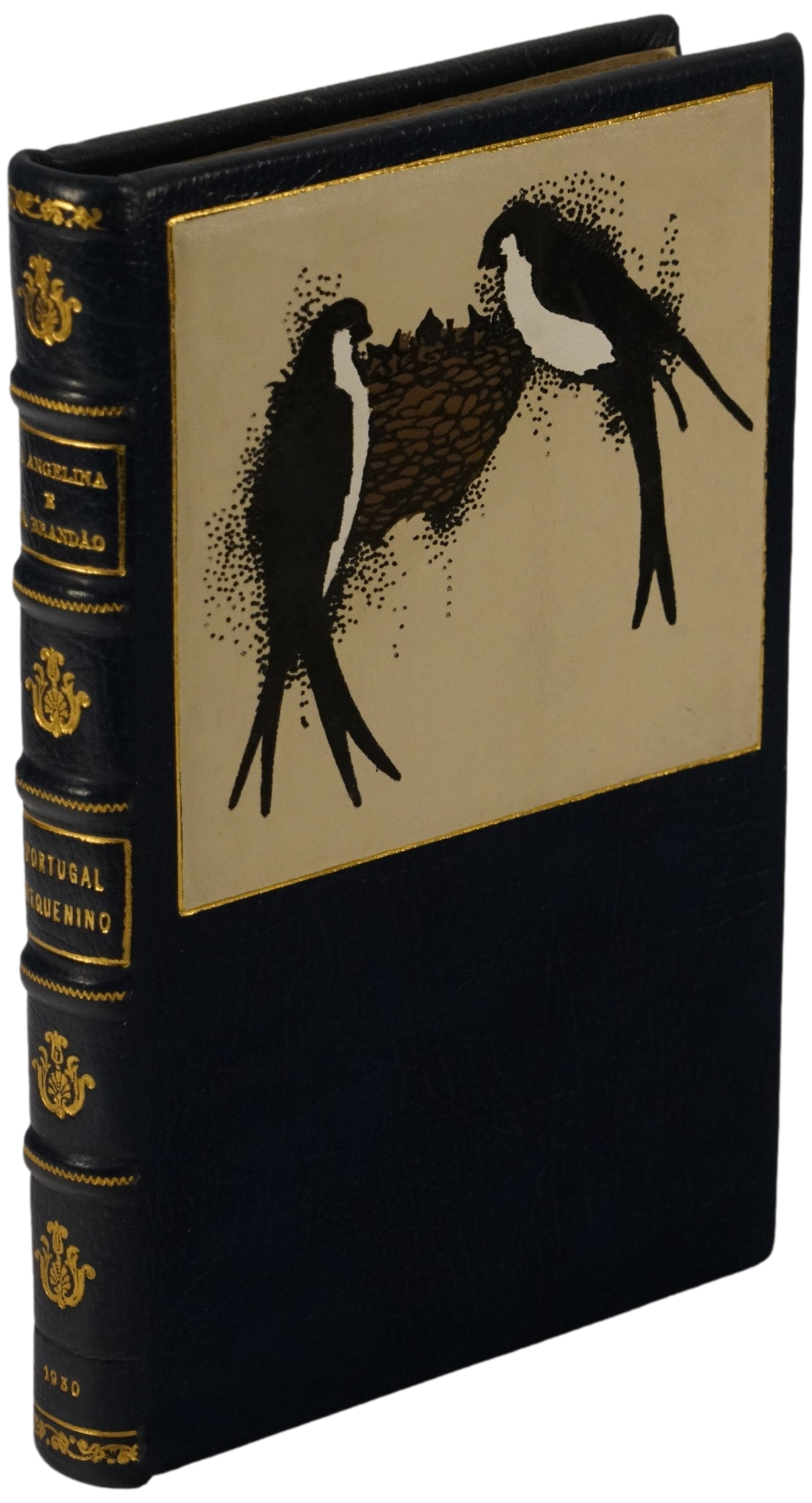 Encadernação inteira de pele com reprodução artística (embutido) do desenho da capa da brochura original.