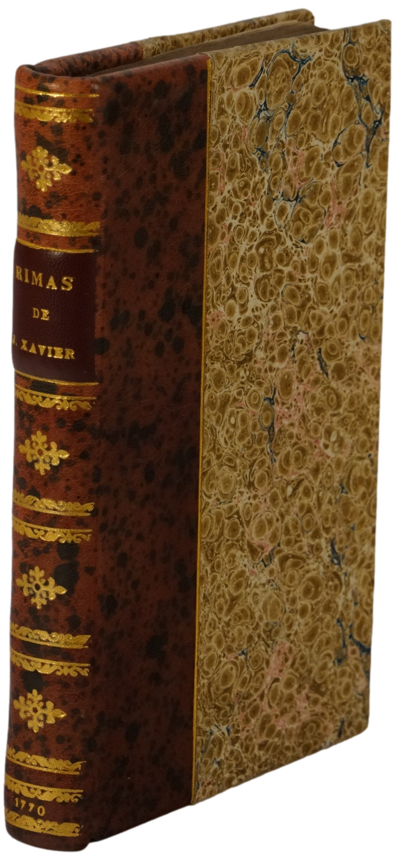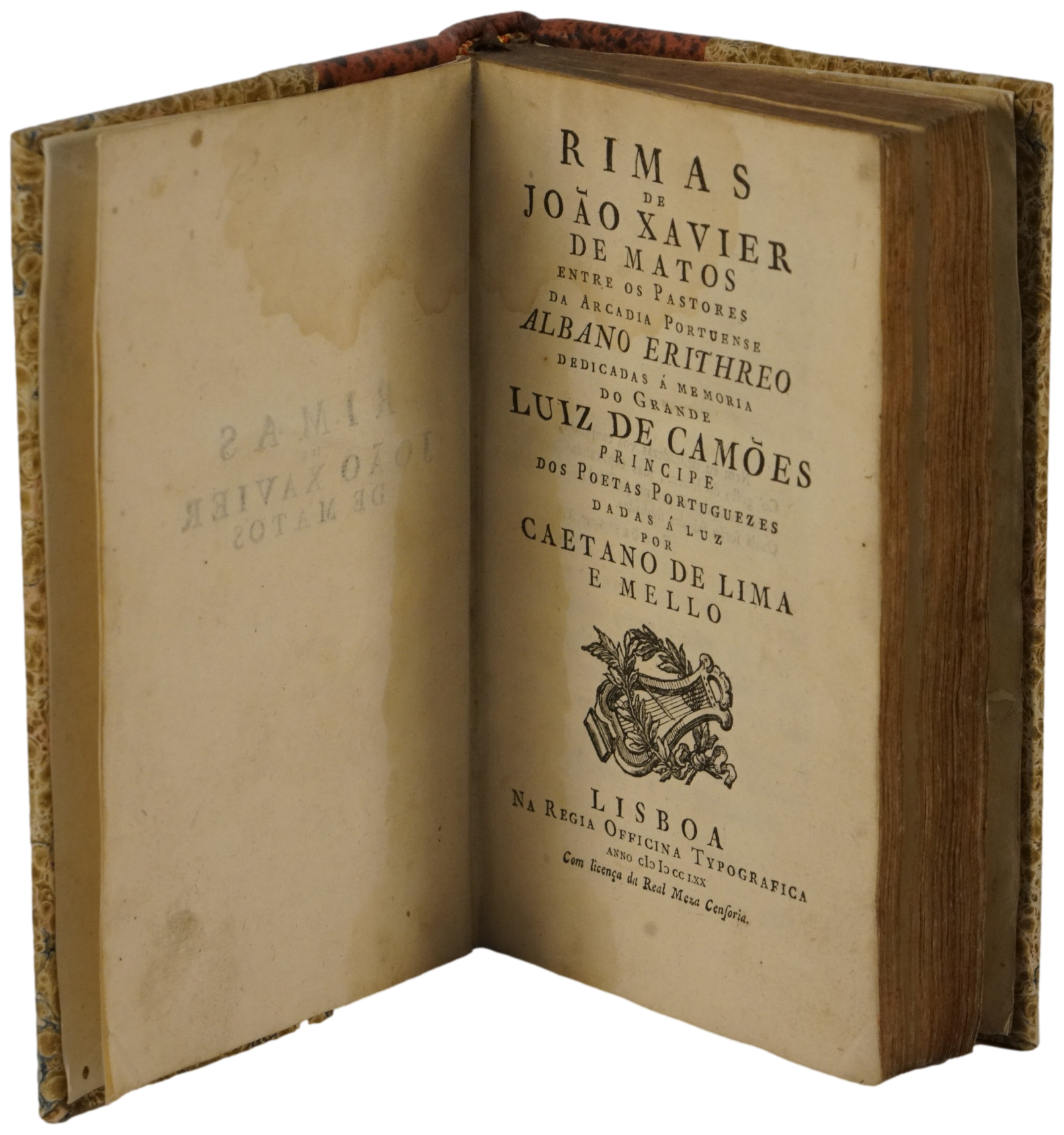 MATOS (João Xavier de).— RIMAS DE  JOÃO XAVIER DE MATOS entre os Pastores da Arcadia Portuense ALBANO ERITHREO dedicadas á memoria do Grande LUIZ DE CAMÕES Principe dos Poetas Portuguezes dadas à luz por Caetano de Lima e Mello. Lisboa. ANNO CIƆ IƆ CC LXX (1770).  11x17,5 cm. VI- 312-IV e