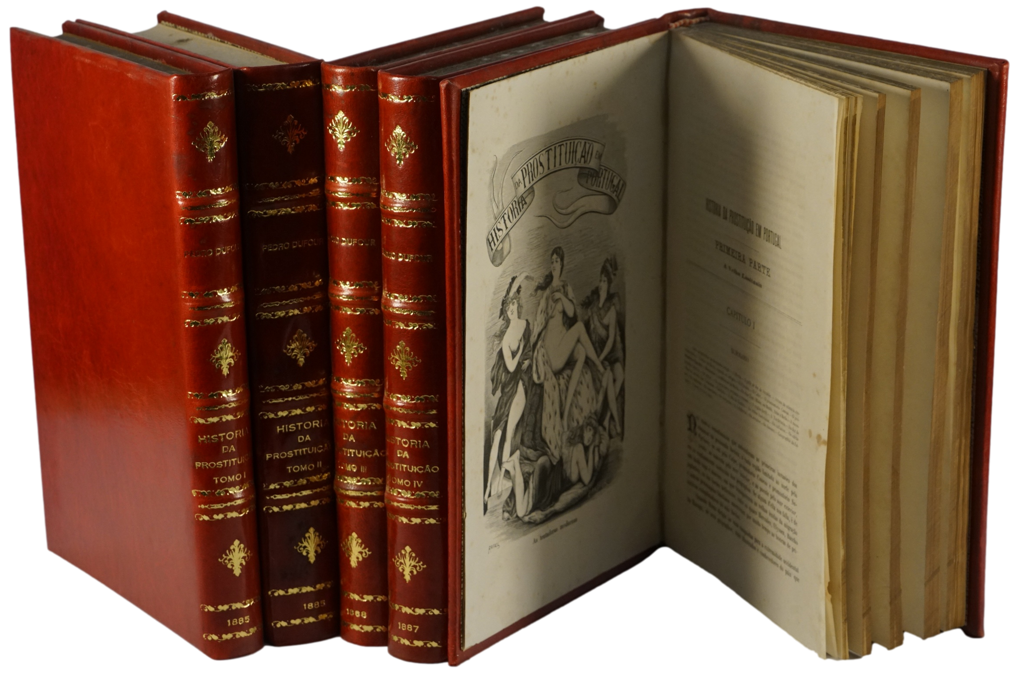 26316-L25DUFOUR (Pedro).— HISTORIA DA PROSTITUIÇÃO EM TODOS OS POVOS DO MUNDO, desde a mais remota antiguidade até aos nossos dias. Obra necessaria aos Moralistas, Util aos Homens de Sciencia e Lettras e Interessante Para Todas As Classes. Notavelmente Ampliada e Enriquecida com Valiosos Estudos por D. Amancio Peratoner e outros escriptores, e seguida de um importante trabalho sobre a História da Prostituição em Portugal desde os tempos mais obscuros da lusitania até nossos dias. Illustrada com Primorosas Gravuras. Empreza Litteraria Luso-Brazileira - Editora. 1885-1887. 5 vols. 20,5x29 cm. E.