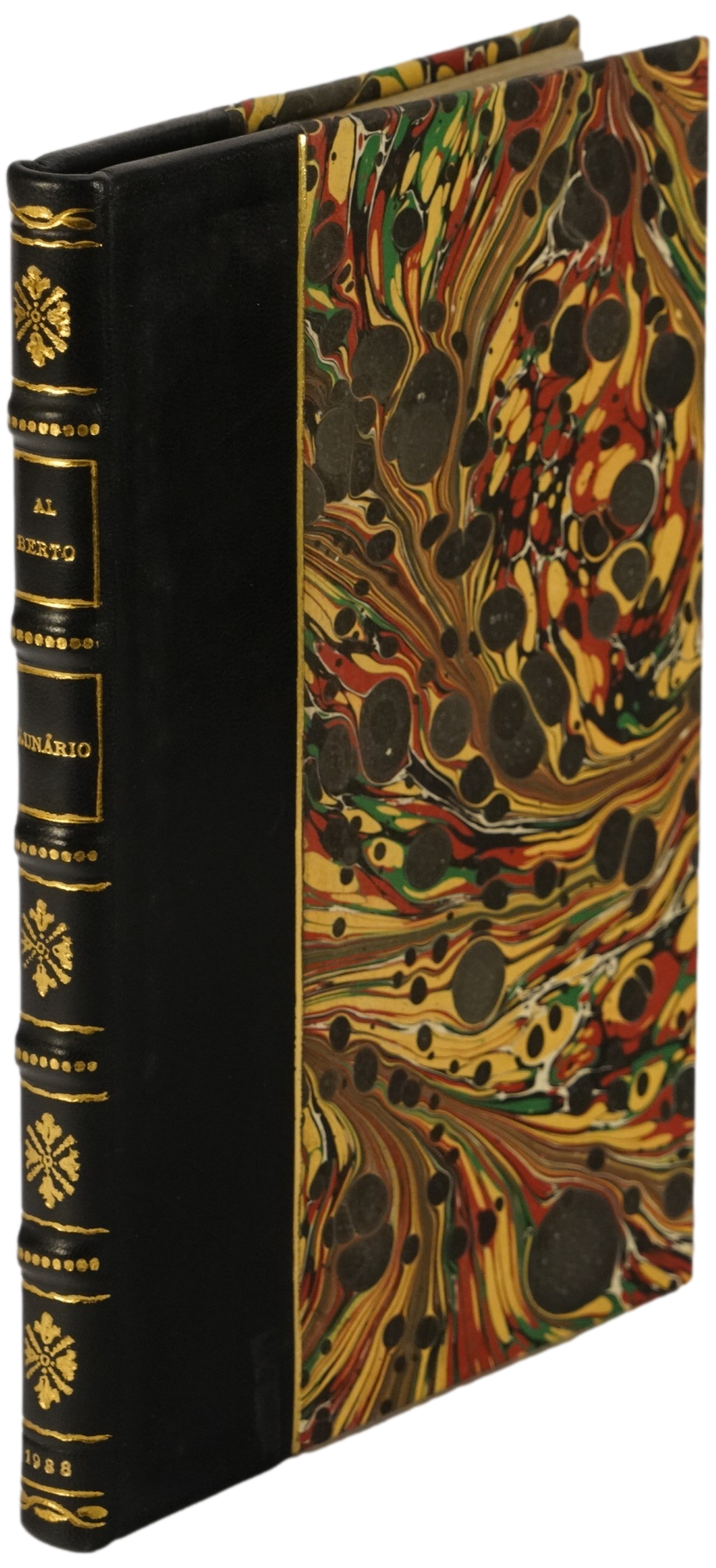 A encadernação, com lombada em pele decorada a ouro, preserva as capas da brochura original.
